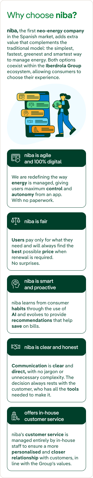 niba, the first neo-energy company in the Spanish market, adds extra value that complements the traditional model: the simplest, fastest, greenest and smartest way to manage energy. Both options coexist within the Iberdrola Group ecosystem, allowing consumers to choose their experience.